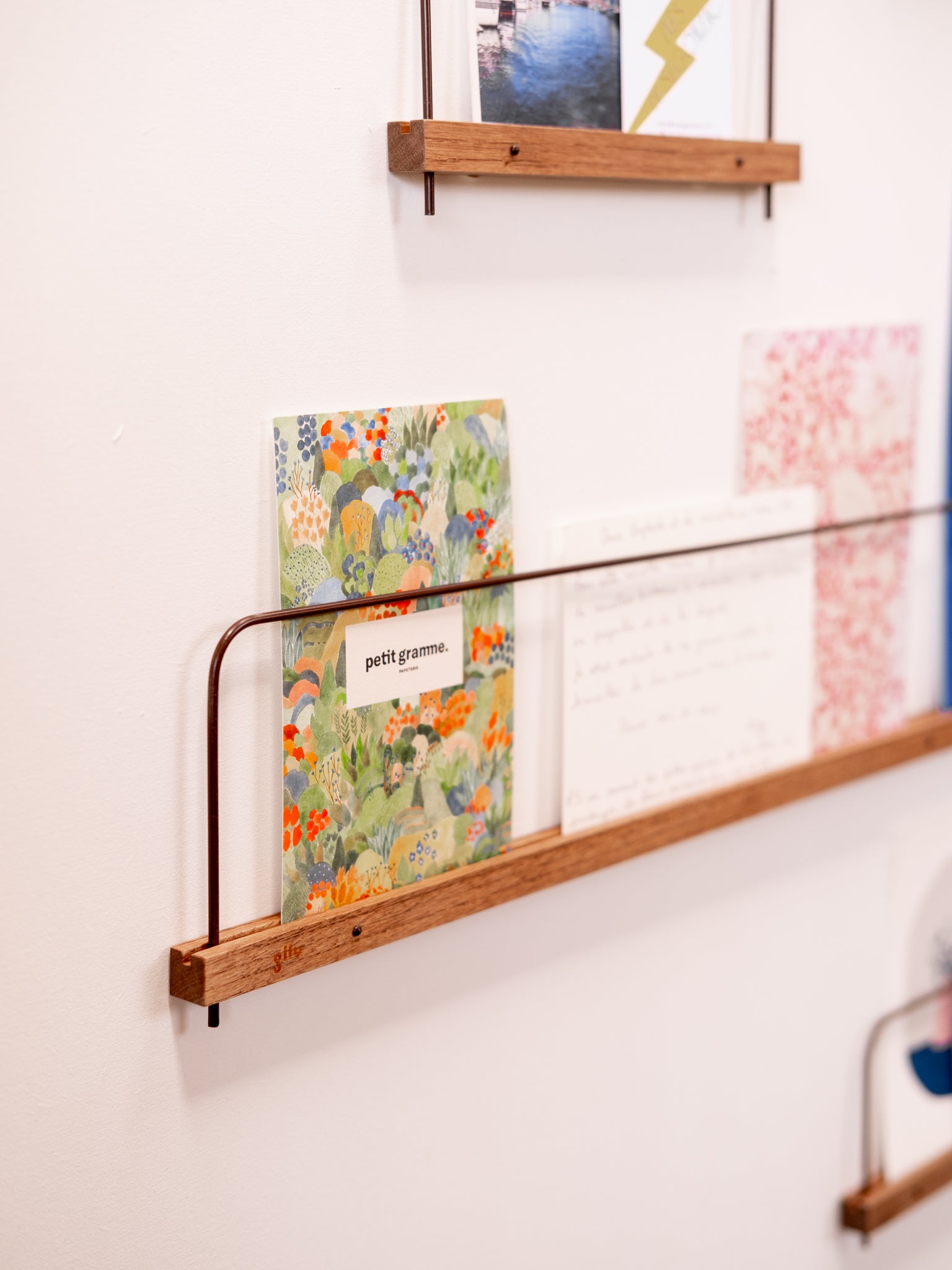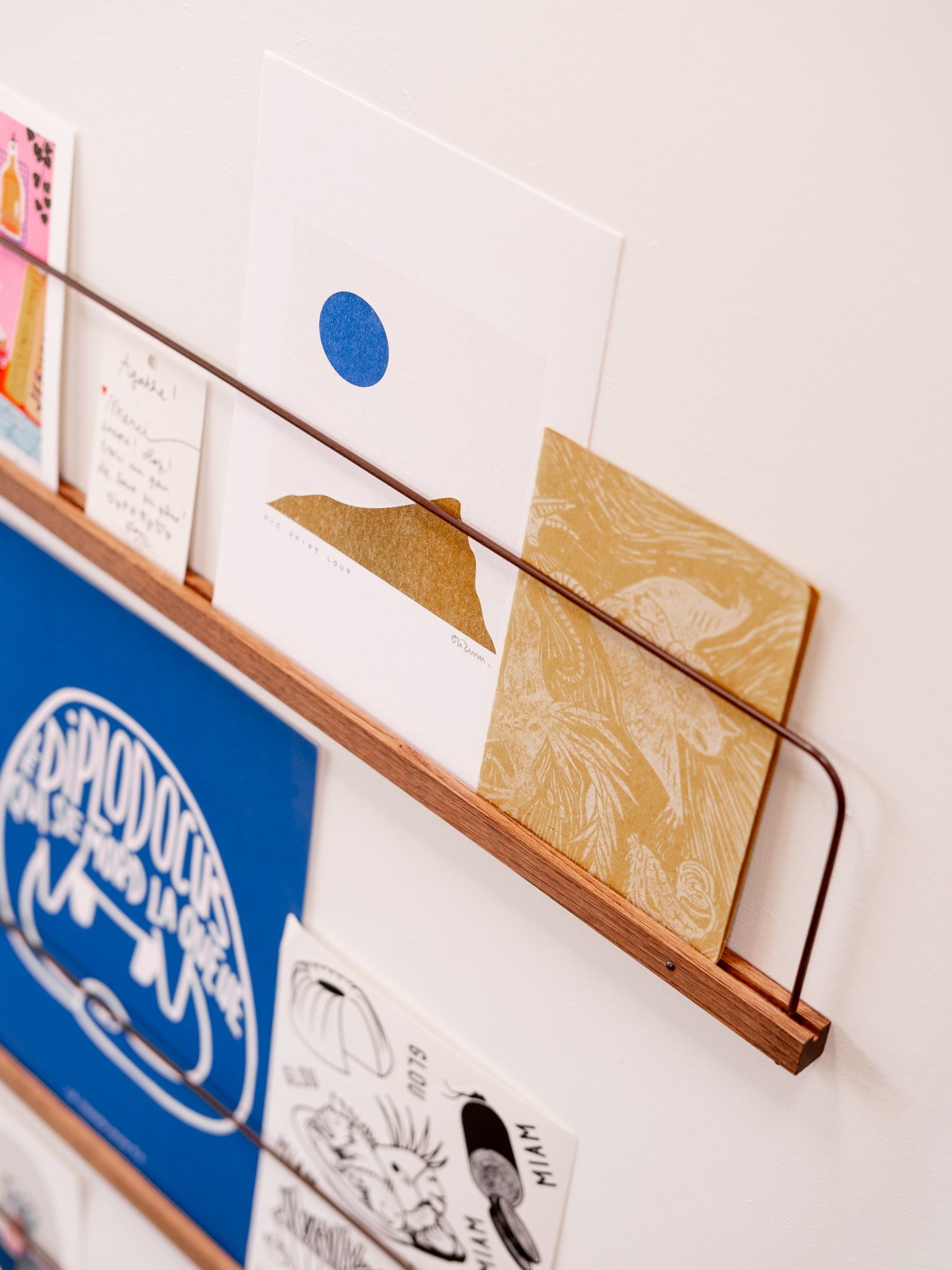 We found ourselves for a long time with boxes and drawers filled with Polaroids and postcards, so we came up with the idea of a shelf allowing us simply to display these photos on the wall and to be able to change them regularly.