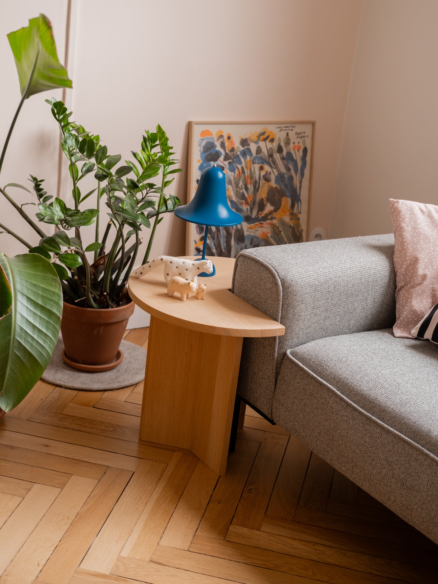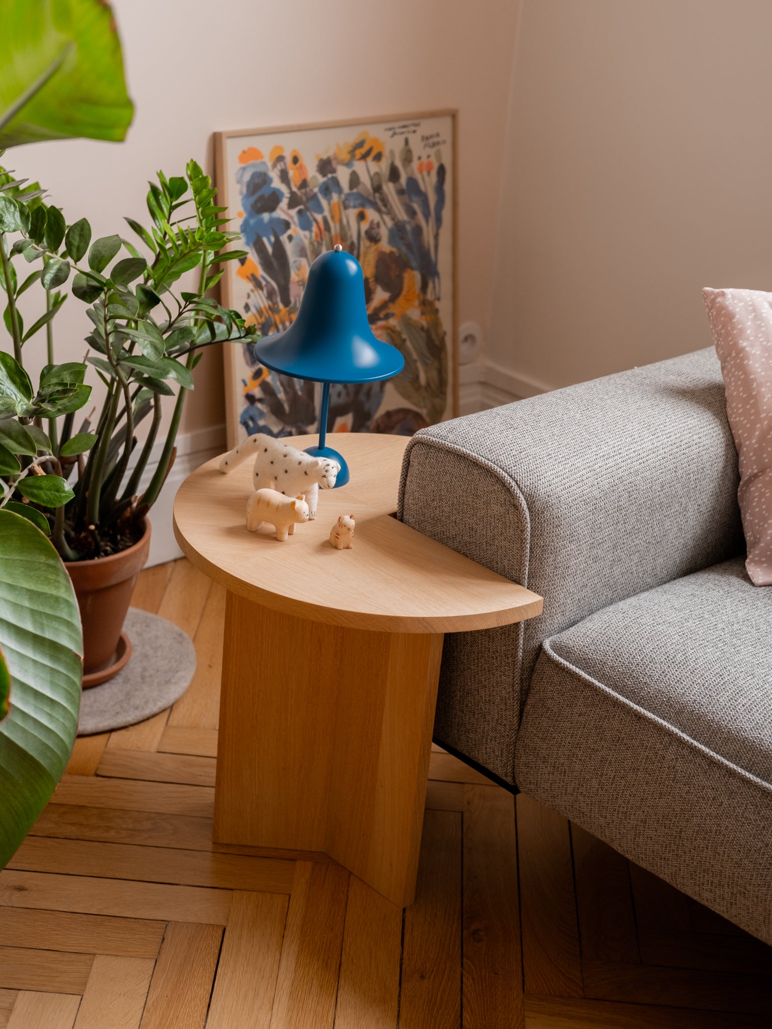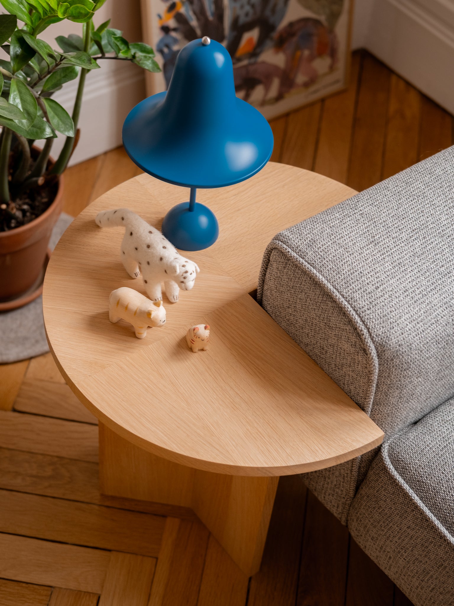 The ¾ Table can be attached to a sofa, another piece of furniture or to an outgoing corner.