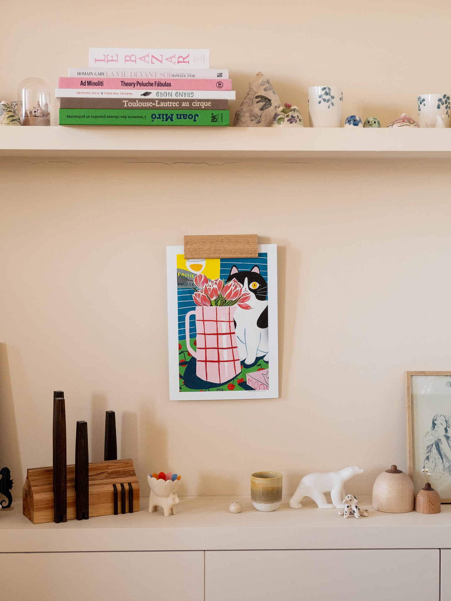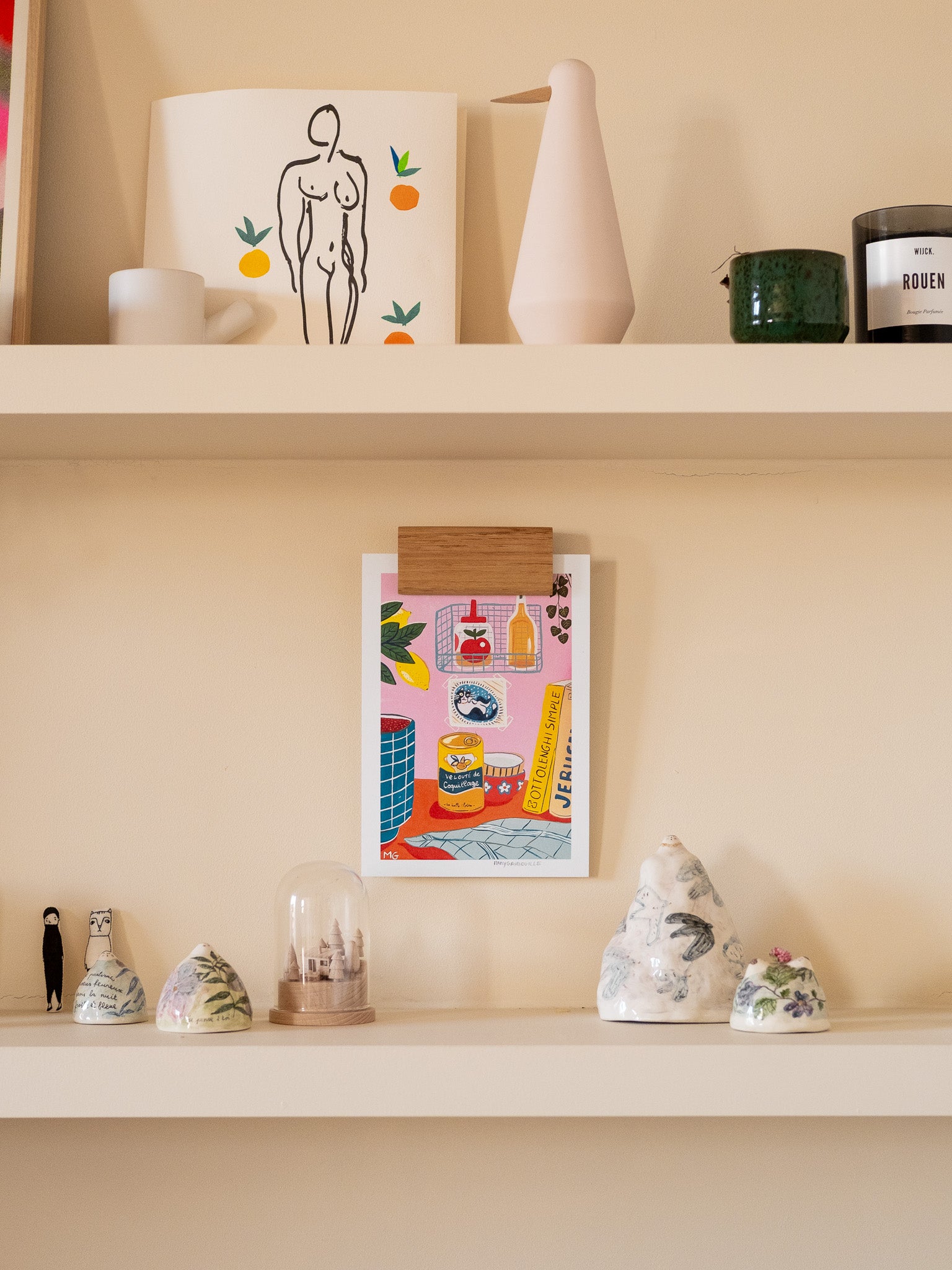 C’est une idée cadeau toute trouvée pour les amoureux d’illustration et de décoration murale, ou simplement une façon facile d’habiller un mur avec quelque chose de personnel, chaleureux et modulable. Une étagère, trois images, et déjà un mur tout décoré.