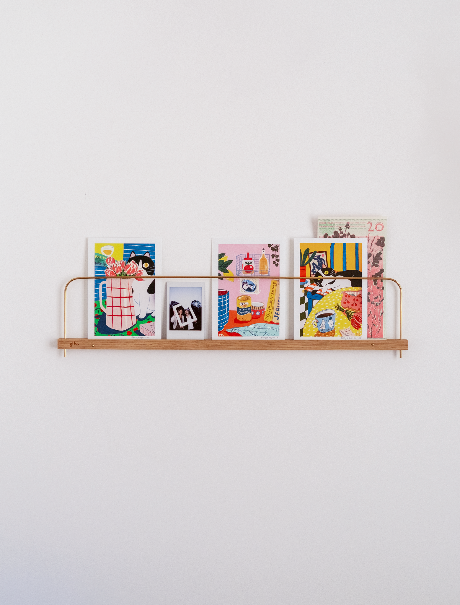 De cette rencontre est né un coffret prêt à poser : notre classique étagères Super-Poses laiton 50 cm accompagnée d’un lot de 3 cartes postales illustrées par Mary Gribouille. L’idée est simple : recevoir une étagère déjà prête à être installée et déjà prête à être habillée. On l’accroche en quelques secondes, on glisse les cartes (ou ses propres photos, souvenirs, petits mots), et le mur prend vie immédiatement.
