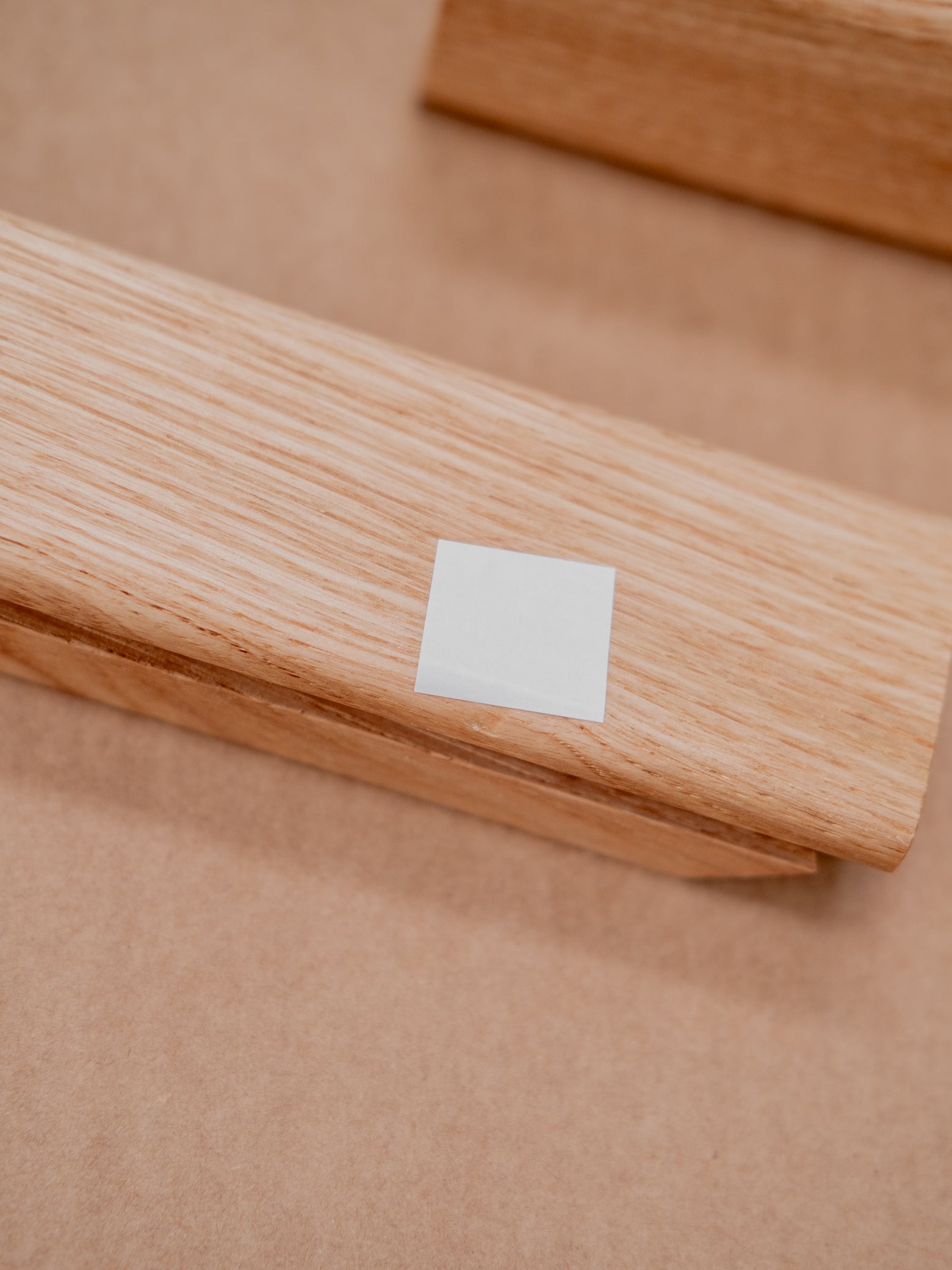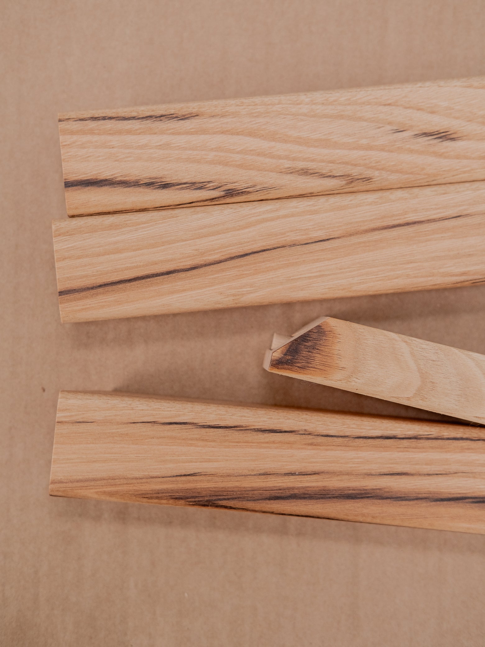 Ce sont des pièces que nous accumulons depuis plusieurs mois. Nous faisons notre possible, dès la coupe du bois, d'éviter les nœuds et les portions inesthétiques afin de réduire le gaspillage de matières.