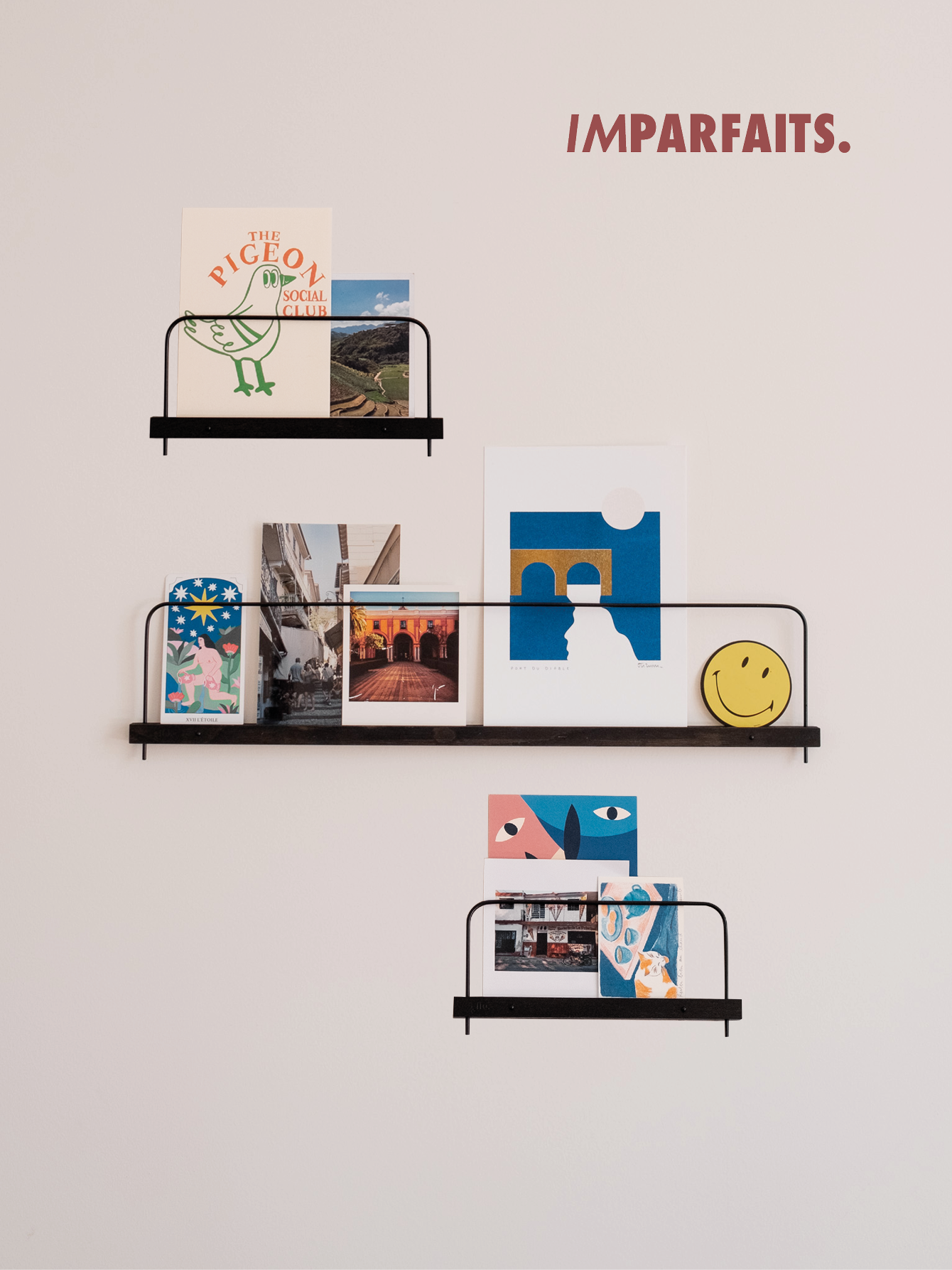 On s’est longtemps retrouvé avec des boîtes et des tiroirs remplis de Polaroïds, et de cartes postales, nous est alors venue l’idée d’une étagère permettant simplement d’exposer ces photos au mur et de pouvoir les changer régulièrement.