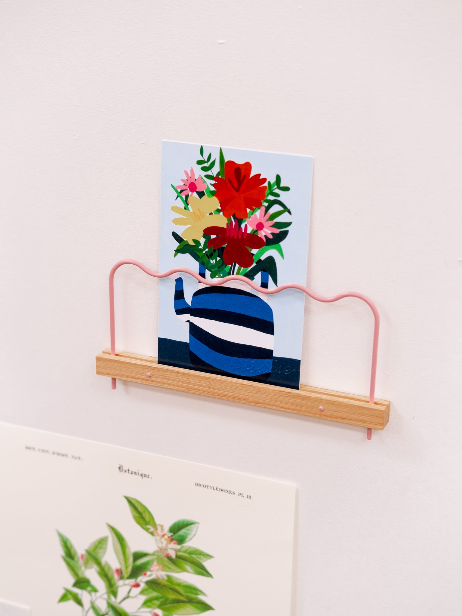 On s’est longtemps retrouvé avec des boîtes et des tiroirs remplis de Polaroïds, et de cartes postales, nous est alors venue l’idée d’une étagère permettant simplement d’exposer ces photos au mur et de pouvoir les changer régulièrement.