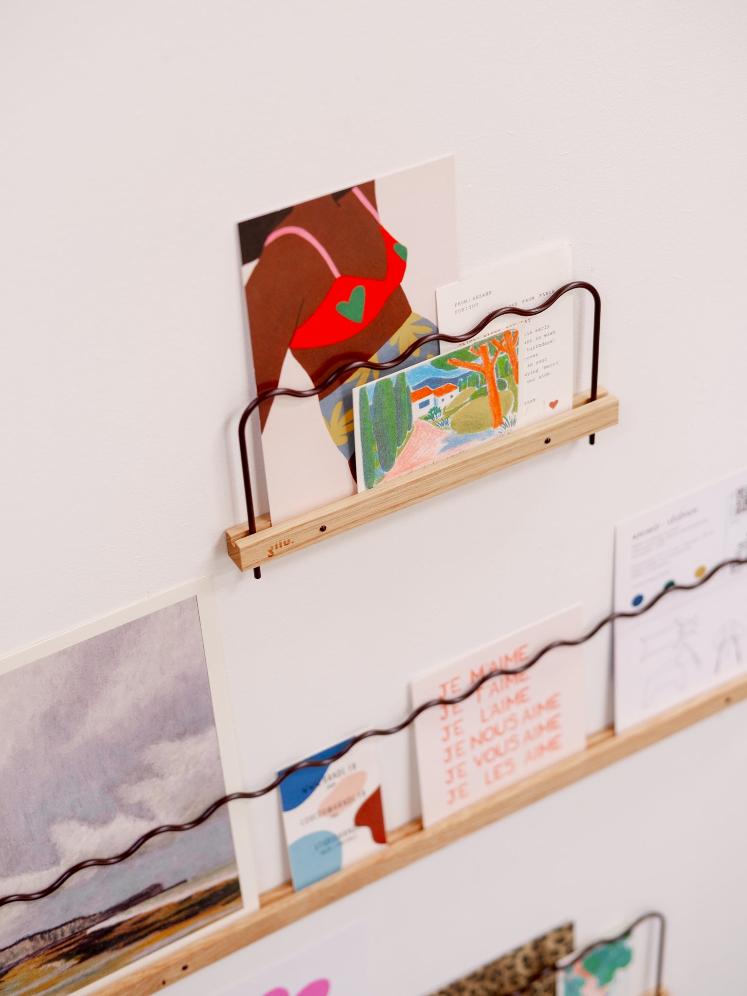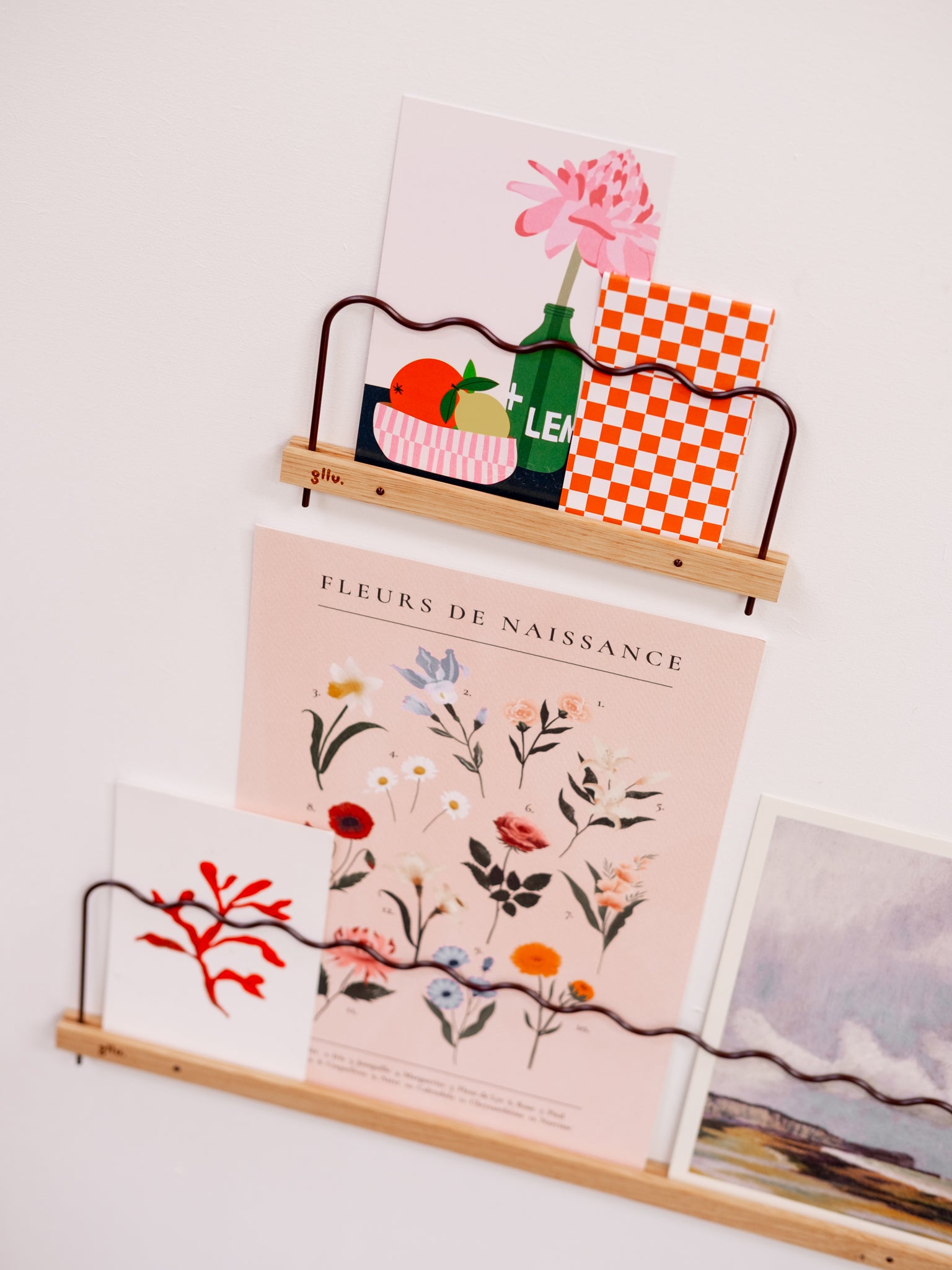 Vos photos, illustrations et cartes postales trouvent facilement leur place, maintenues grâce à la hauteur de la barre. Fixation simplifiée avec des clous, et hop, votre mur prend des couleurs en un clin d’œil !